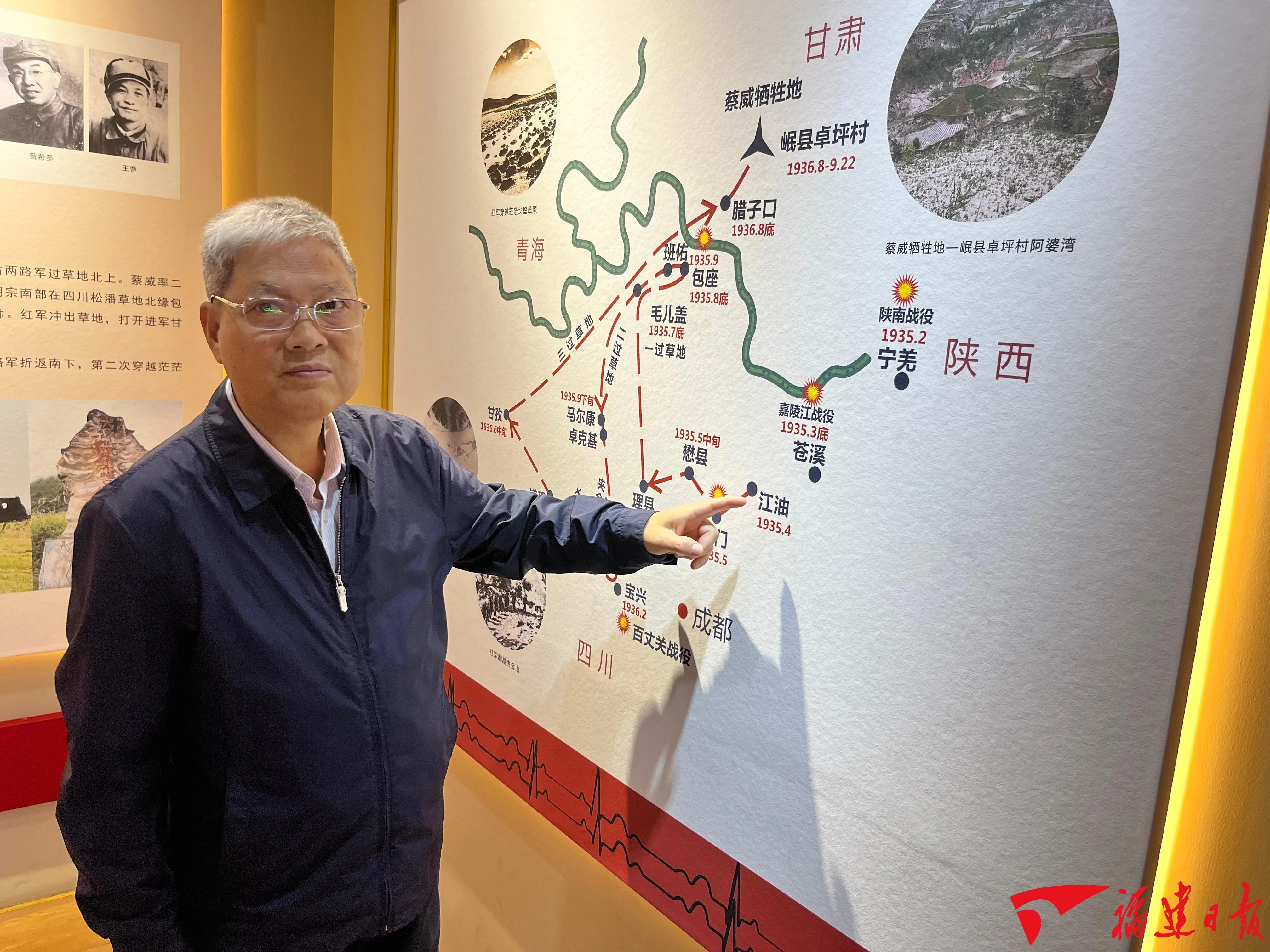 蔡述波在蔡威事迹展览陈列馆讲述蔡威烈士在长征途中的故事。
