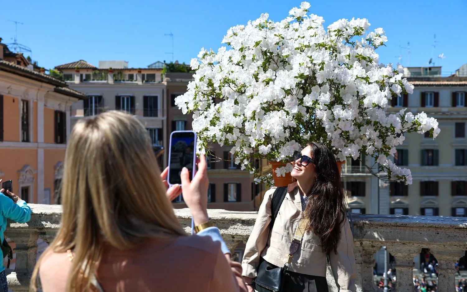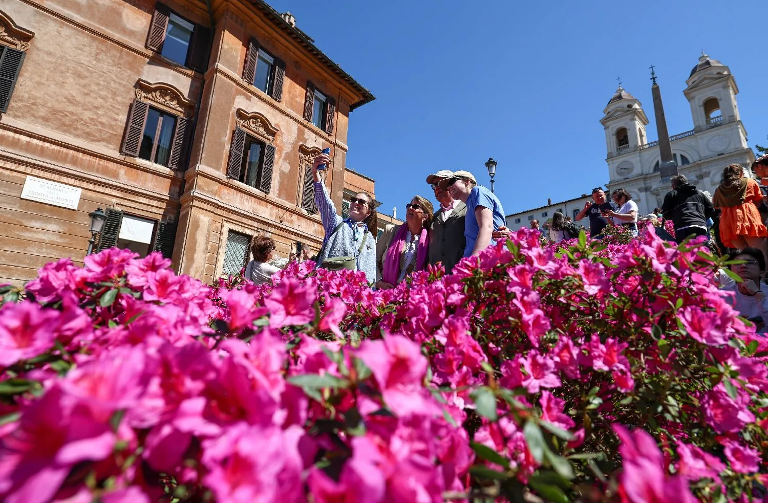 4月23日,在意大利罗马的西班牙广场,人们与盛开的杜鹃花合影。