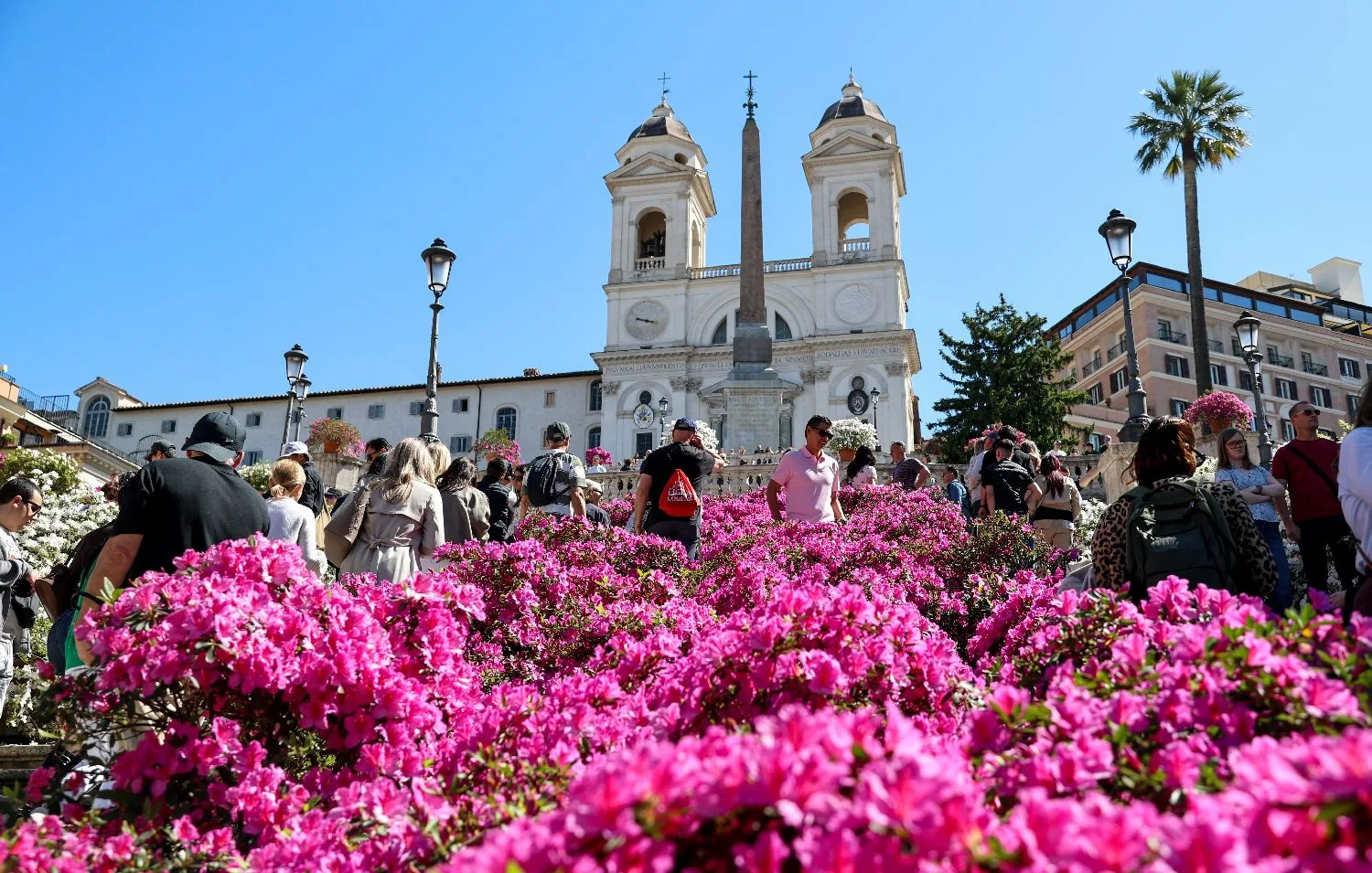 4月23日,在意大利罗马的西班牙广场,人们欣赏盛开的杜鹃花。