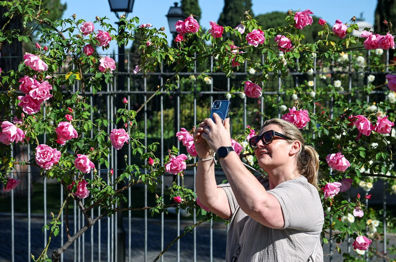 4月23日,在意大利罗马的一处玫瑰园中,一名男子欣赏玫瑰花。