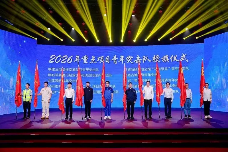 活动现场,还为荣获福建青年五四奖章和福建新时代青年先锋的重点项目青年突击队集体及个人颁奖,并为2026年重点项目青年突击队代表授旗。全省各级团组织积极响应党的号召,团结带领广大青年聚焦福建省重点项目建设,组建了2000余支青年突击队,投身各项“急难险重新”任务,以实际行动彰显了新时代八闽青年风采。
