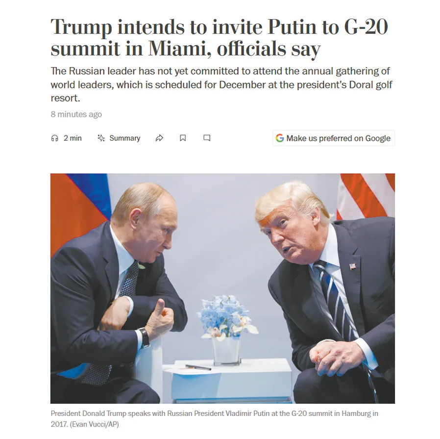【环球时报驻俄罗斯特派记者 肖新新 戚容】美国《华盛顿邮报》23日披露称,美方有意邀请俄罗斯总统普京出席定于今年12月在美国迈阿密举行的二十国集团(G20)领导人峰会。匿名政府高级官员在向媒体吹风时说:“目前尚未发出正式邀请函,但俄罗斯作为G20成员,届时将受邀出席部长级会议及领导人会议。”美国总统特朗普当天在白宫椭圆形办公室对记者说,如果普京来参会,可能将是一件“有益”的事情。这位俄领导人最近一次亲赴现场出席G20峰会是在2019年。据俄罗斯塔斯社报道,俄总统新闻秘书佩斯科夫24日表示,普京可能会前往迈阿密参会,也可能不会,无论如何,俄方将派出适当级别的代表。