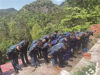 在陈延寿墓碑前,温州各地多支蓝天救援队的队员鞠躬送别队友。受访者供图