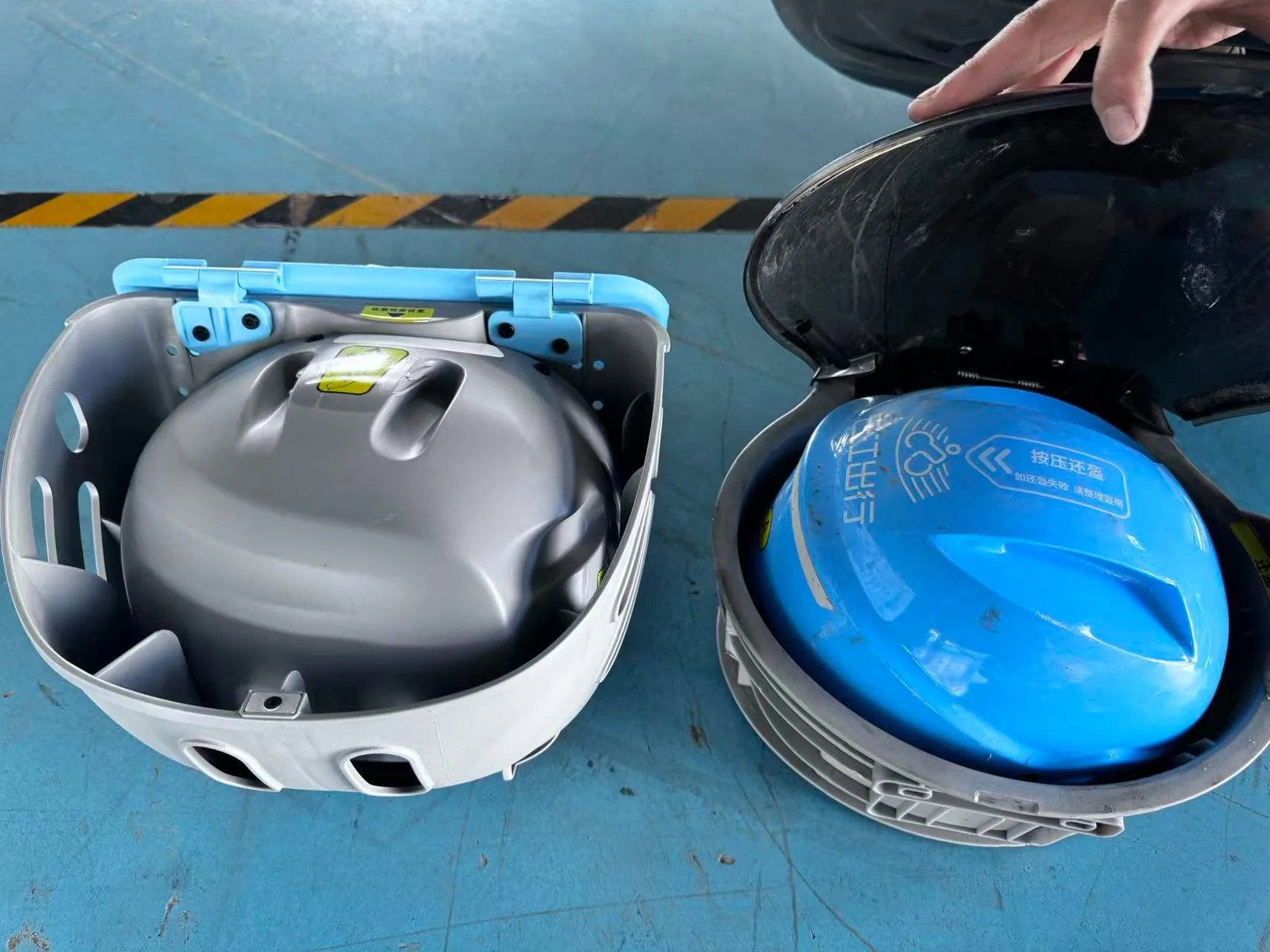 新头盔有什么改变?“自2024年7月上线运营以来,云江出行始终将市民骑行安全与出行体验放在首位,此次头盔换新,在实用性、舒适度、耐用性等方面进行多项优化升级。”瑞安市城市运营管理服务有限公司总经理黄洁介绍,“新款头盔由以往的黑盖灰框改为蓝盖灰框,色调与整体车型更协调。收纳盖板升级为手动翻盖加磁吸闭合,开合更顺滑稳固的同时,能有效减少骑行颠簸带来的哐当噪音。筐体增添了多条通风口,头盔放置改平放为侧放,可有效改善易进雨水积灰等问题,进一步保持头盔干净整洁。”
