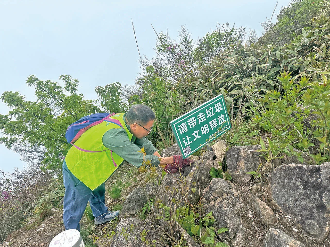 活动接近尾声,天空飘起了小雨,志愿者们最后检查了一遍山林,确认没有遗漏的垃圾,才慢慢收队下山。“其实保护环境这件事很简单,只需要每个人弯腰伸手就能做到。”李雷指了指新立的文明牌说,清掉垃圾只是开始,让“文明释放”才是保护环境更长的路。