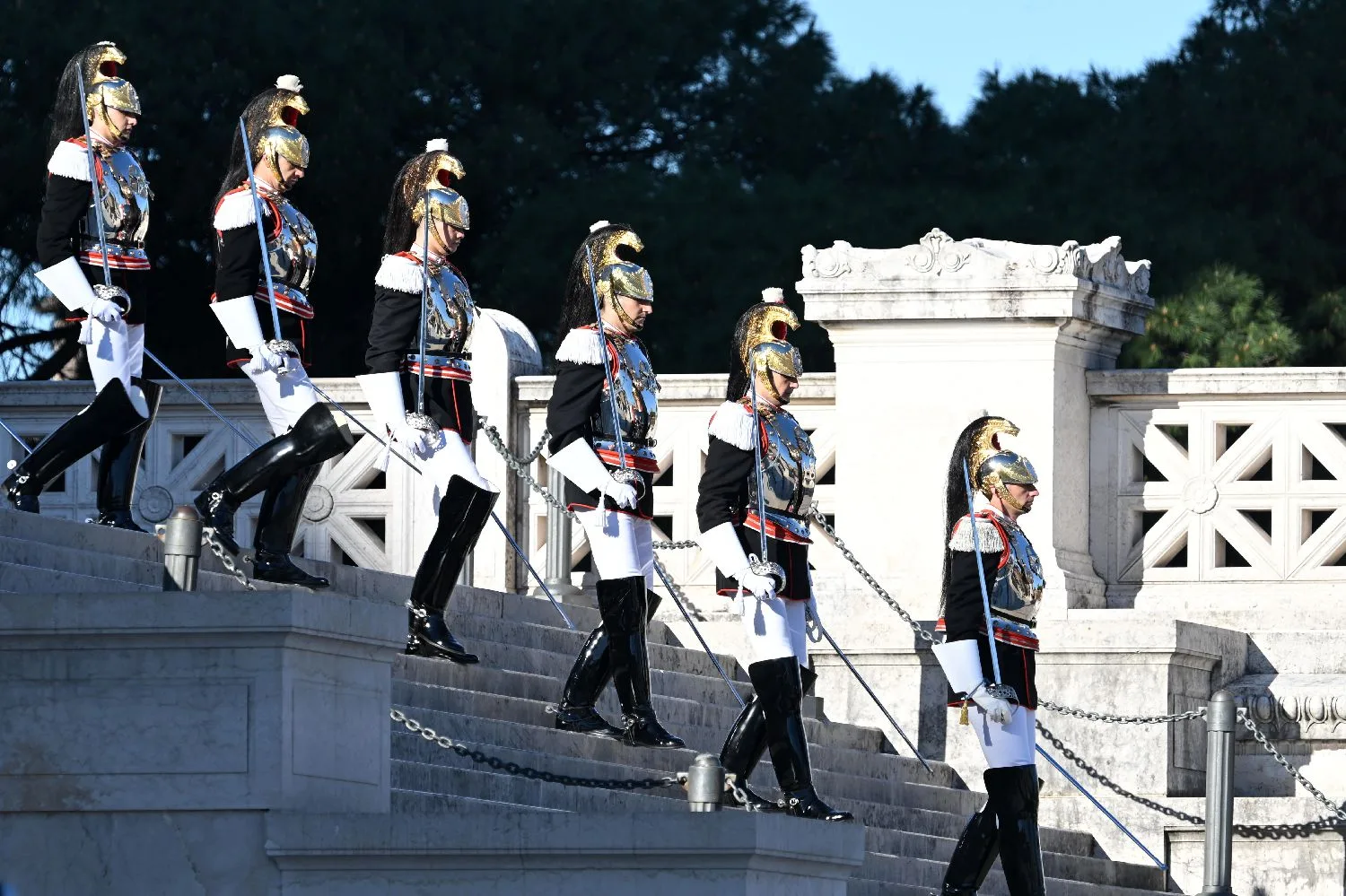 4月25日,在意大利罗马,总统卫队士兵在纪念活动上列队。
