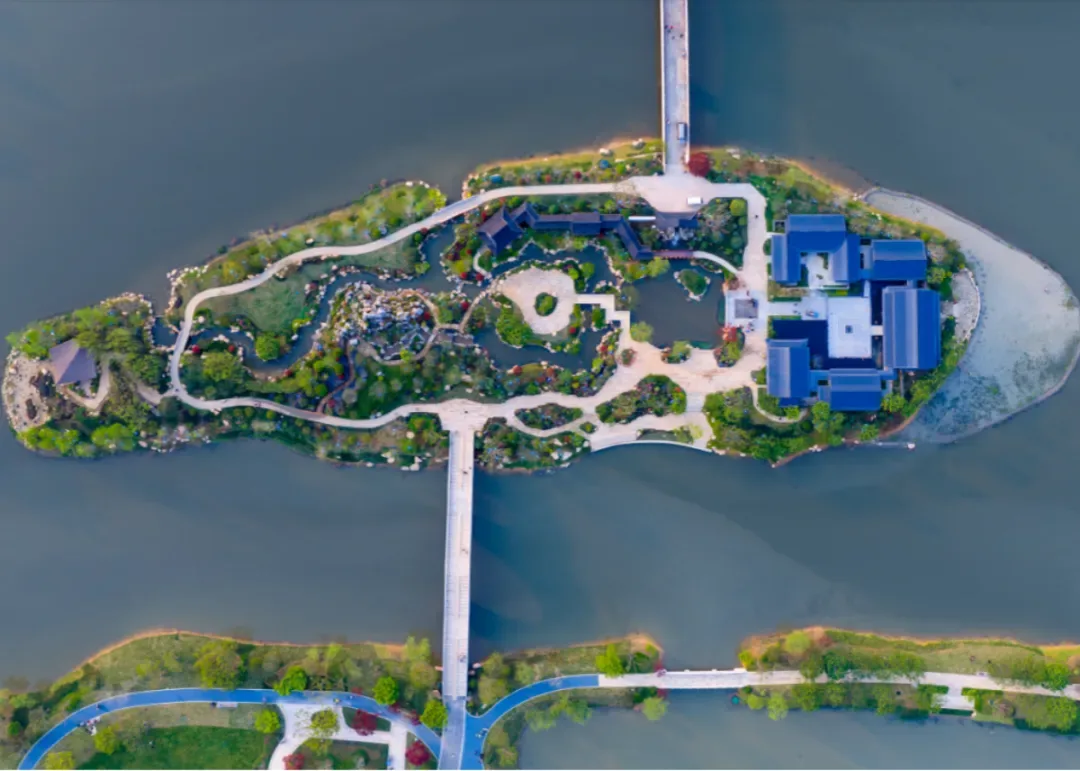 从郭公阁上俯瞰,瓯越园宛如一条狭长的玉带,静静卧在水中。