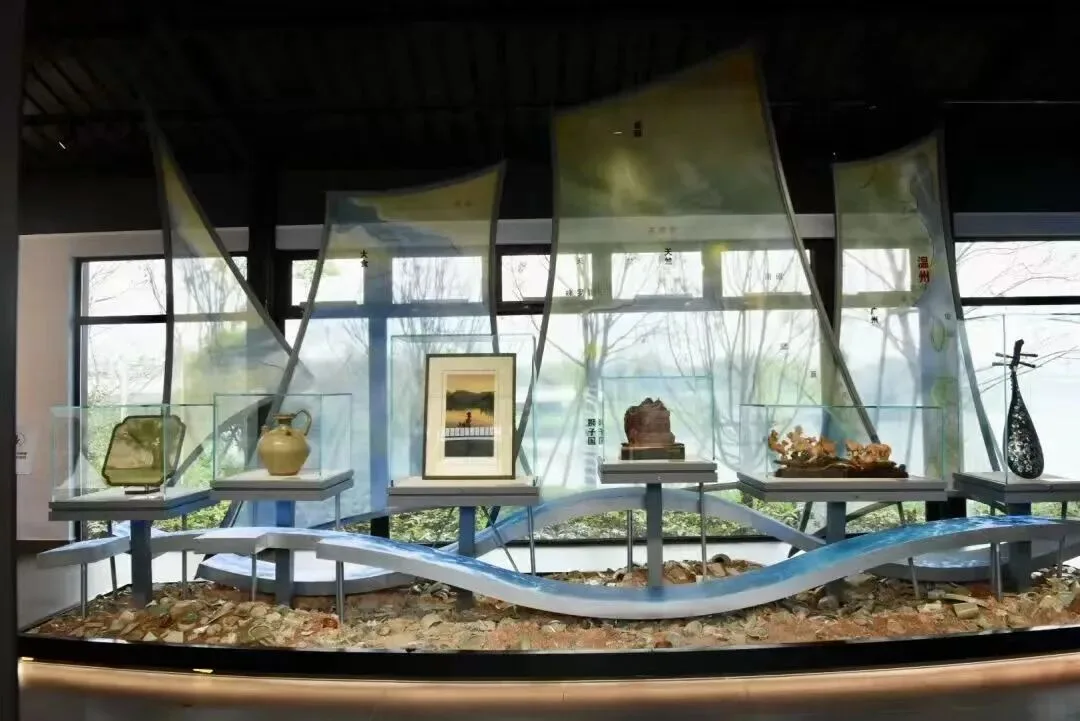 迈入序厅,游客的视线会被一艘“船”牢牢抓住。它似船非船,船底铺着模拟朔门古港出土的瓷器,两道波浪屏翻涌出千年商港的韵味。船身由“三瓯三塑”六件非遗作品构成,分别是瓯塑《榕和》、瓯绣《楠溪江》、瓯窑《鸡首壶》和温州石雕《古厝新韵》、黄杨木雕《八骏马》、贝雕《四弦琵琶》。船帆上,绣着海上丝绸之路沿线城市名。“这船有故事,一看就知道温州靠海、会做生意、走得很远。”一位上海来的退休教师站在船前看了很久。
