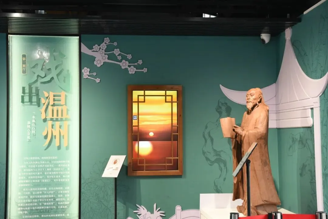 第一扇门,推开的是“戏出温州”,永嘉昆曲是绝对的主角。千年古沉木雕刻的高则诚像立在展厅一侧,旁边是《琵琶记》文献和获奖剧照。一旁的AI虚拟体验区里,年轻游客三五成群,排队体验一键换装,感受永嘉昆曲经典戏曲人物风姿。