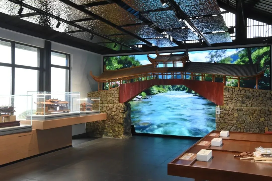 第二扇门,打开了“桥通四方”的宽广。泰顺编梁木拱桥营造技艺被“拆”开了给人看。一座廊桥艺术装置架在绿水屏幕前,旁边是四类不同形态的微缩廊桥模型和互动搭建区,几个孩子正试着把木构件拼到一起。