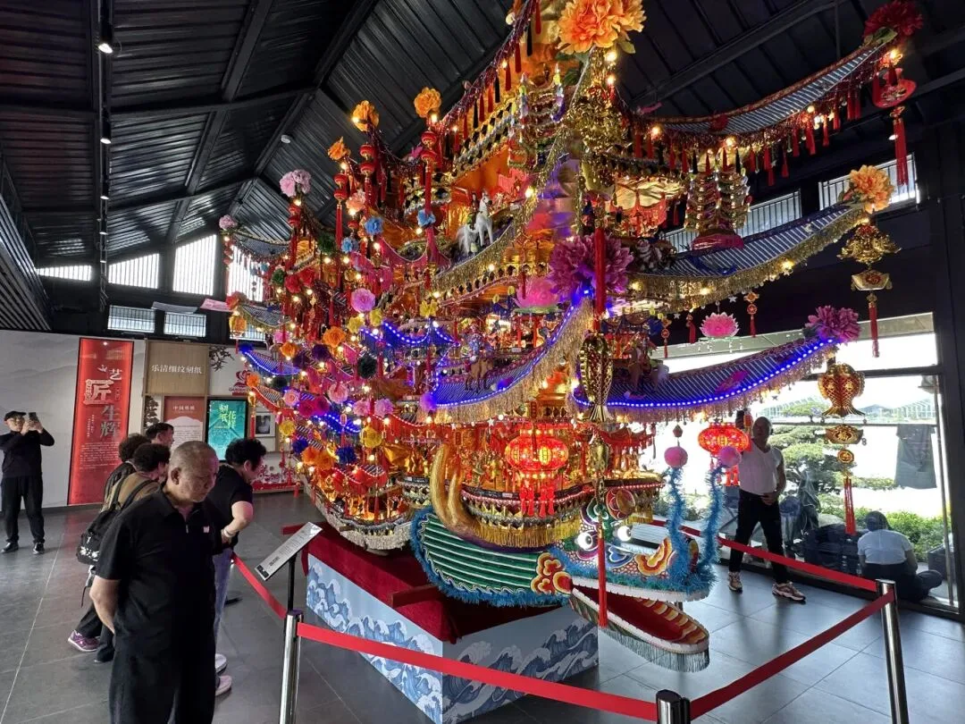 第三扇门,通往“艺匠生辉”。全国首个电动手动二合一的首饰龙装置是这里的“流量担当”。五层楼的首饰龙里,藏着300多个人偶和80多个动态场景。齿轮一经转动,小人偶各自忙碌。旁边展示着乐清细纹刻纸,刀刻线条细密如发。