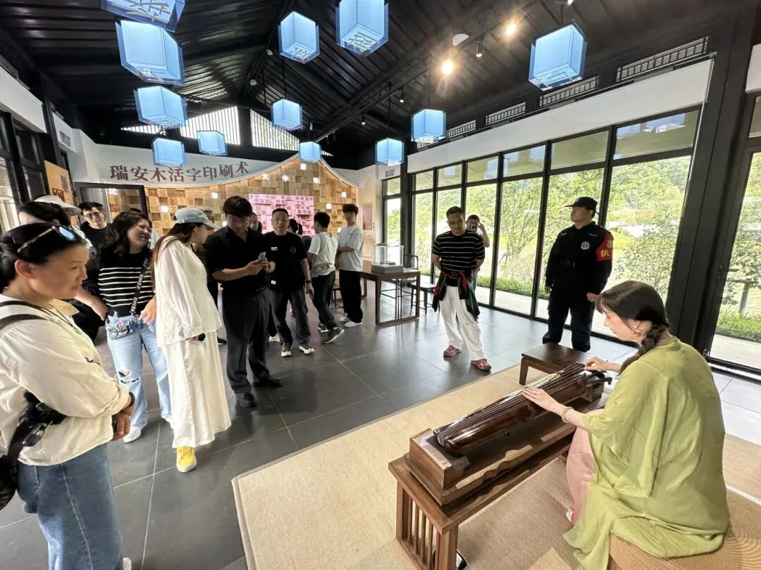 第四扇门,打开“墨印千秋”。瑞安木活字印刷术已有八百多年历史,至今仍在活态传承,刻字、排版、印刷等流程保留完整。展厅里还有一架激光无弦琴,致敬温州籍浙派古琴鼻祖郭楚望。