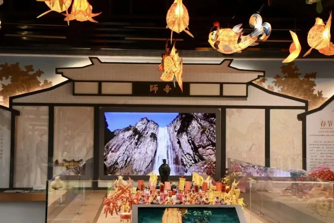第五扇门,展示了“瓯风华彩”。民俗类非遗“太公祭”通过米塑的艺术手法,还原出祭祀与巡游场景。伯温家宴、鱼灯、刘伯温传说都在这里有所体现。最热闹的是AI刘伯温互动区,游客对着屏幕问“刘伯温”问题,帝师模样的AI会一一作答。
