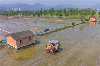 昨天,在瓯海区潘桥街道的水田内,农户正驾驶插秧机忙碌作业。连日晴暖,我市迎来早稻插秧黄金时节,田间处处焕发盎然生机。苏巧将 蔡温瑞 摄
