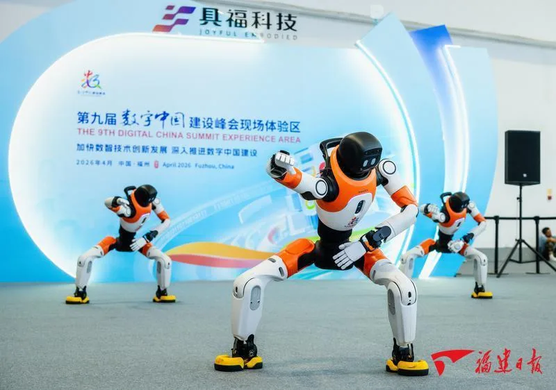 2026年4月28日,在第九届数字中国建设峰会展会现场表演舞蹈的具福机器人灵犀X2具有高灵巧运动与多模态交互的能力。林晓烨 摄