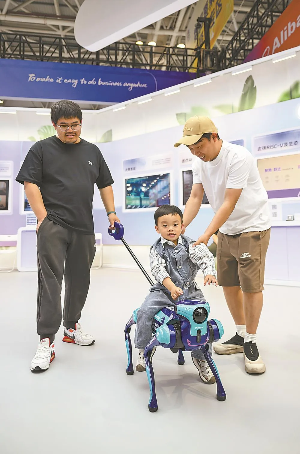 4月28日,在第九届数字中国建设峰会现场,由高德带来的全球首款开放环境全自主智能导盲犬——“途途”吸引了许多来宾观看、体验。福建日报记者 施辰静 摄