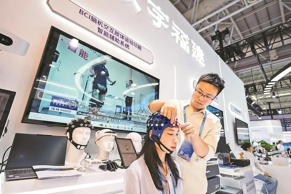 4月28日,在数字福建展区,福建致远科创的工作人员正在演示用于康复训练的BCI脑机交互肢体运动功能智能辅助系统。福建日报记者 施辰静 摄
