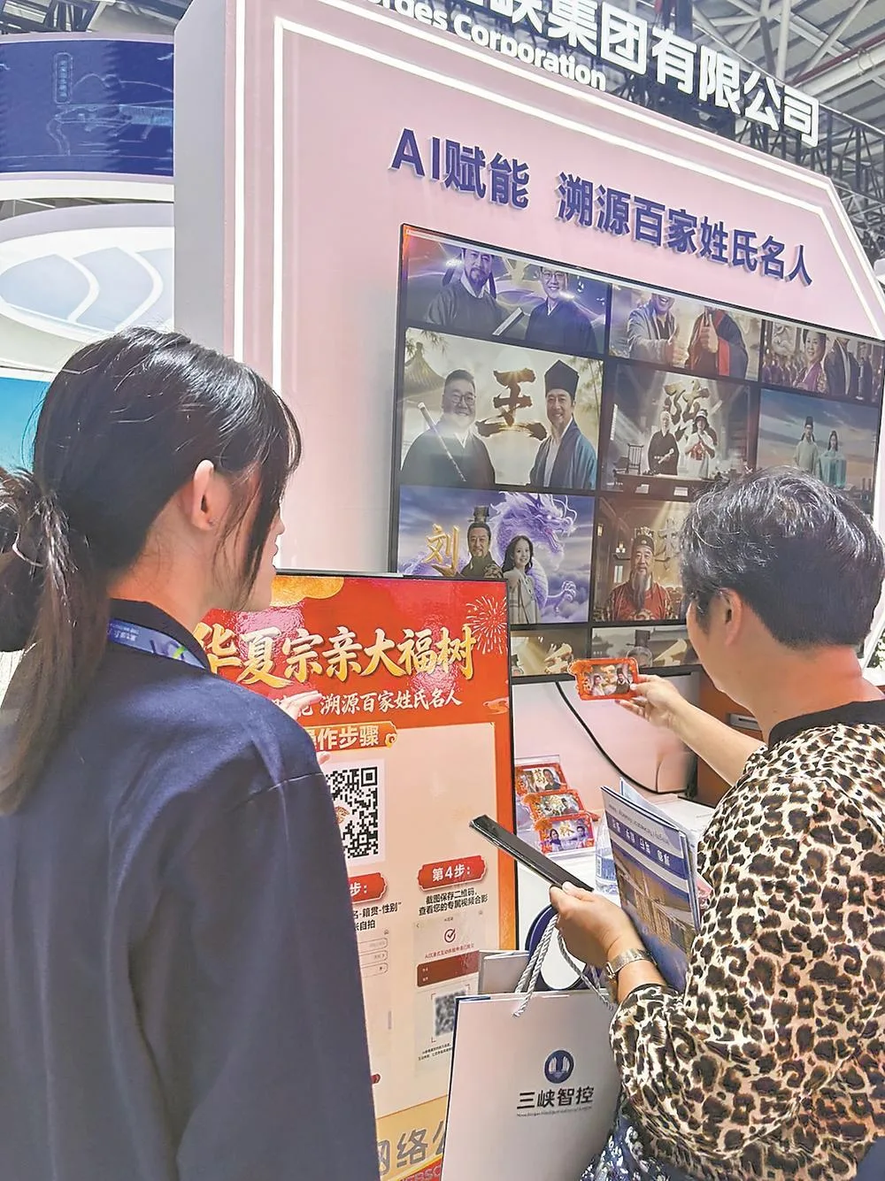4月28日,众多市民和参展企业代表在网龙展区体验由AI、VR、AR等技术共同编织的数字奇境。图为市民输入姓氏与祖籍信息,AI随即生成一棵专属3D宗族“福树”,并与姓氏名人同框合影。福建日报记者 林蔚 摄