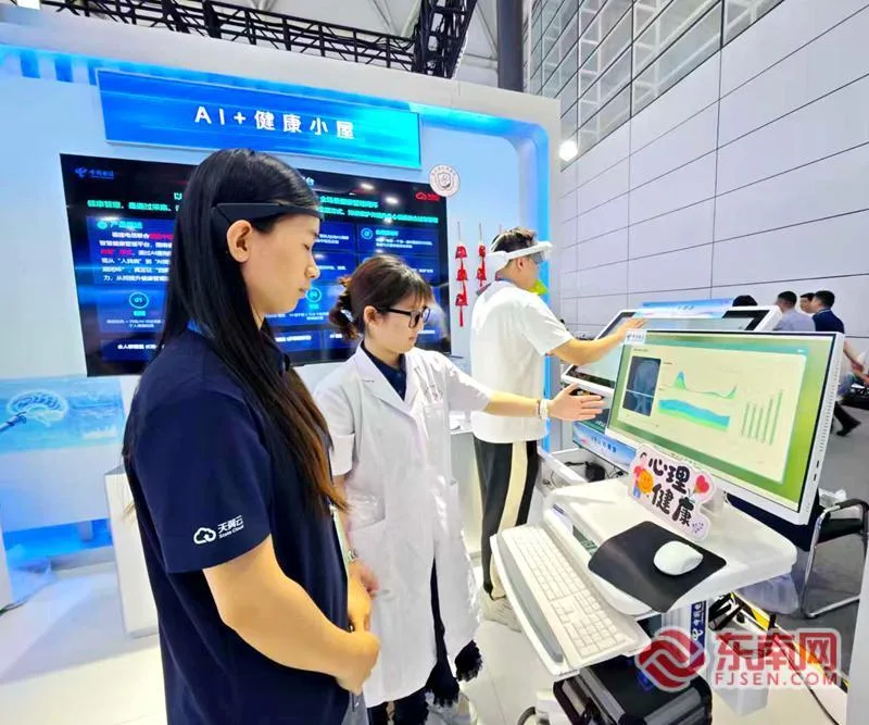 30日,在第九届数字中国建设峰会现场体验区中国电信智慧医疗展区,智慧医疗展区的健康管理、AI健康小屋等产品引起很多观众的参观体验,其中一款名为“脑电智慧心理健康测评系统”的产品吸引了不少人排队体验。记者也忍不住挤进人群体验了一把。