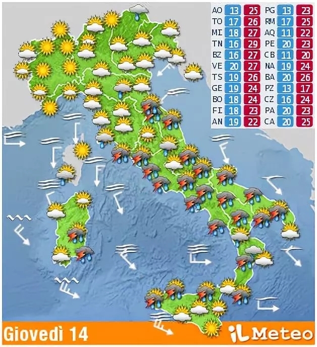 今天,雷雨天气将会沿着利古里亚大区(Liguria)东侧和托斯卡纳地区(Toscana)一路向南移动,与此同时,东北部平原地区也将会受到影响。从撒丁岛,到几乎所有的中部地区,如佛罗伦萨、博洛尼亚、罗马等,都将迎来巨大的天气变化。