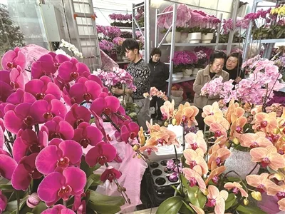 “如今顾客不仅看重‘好意头’,还追求个性化与设计感。”在弥花园艺中心,来自国内外的新颖品种争奇斗艳:花瓣带渐变晕染的“胭脂”蝴蝶兰、姿态优雅的进口朱顶红、色泽独特的蓝色澳梅、玲珑红艳的北美冬青切枝。景艺园艺负责人告诉记者,其基地培育的蝴蝶兰就有十多个品种,除了经典红色系,淡粉、鹅黄、雪青、宝蓝、橙色等色彩也颇受欢迎,日销可达500株。
