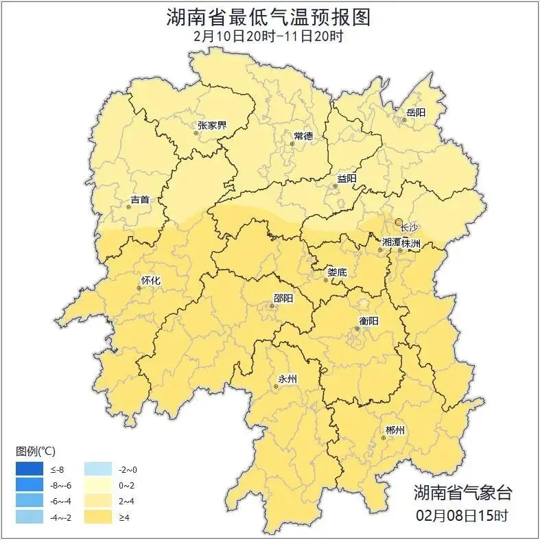 9日晚上至10日白天,湘中以北小雨转多云,其他地区阴天有小雨;北风2~3级;最低气温湘西北1~3℃,其他地区4~7℃;最高气温湘西北、湘东南12~16℃,其他地区8~11℃。
