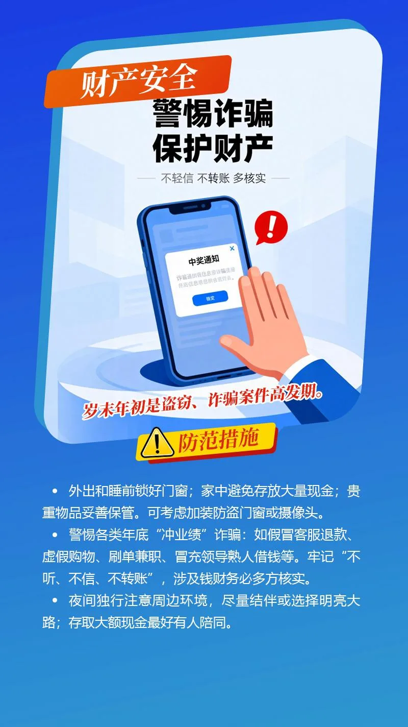 岁末年初,眼看就到了欢聚团圆、忙碌收尾的春节了。但生活中一些看似不起眼的小习惯,却可能化身威胁生命财产安全的"隐形杀手"。小编特意整理了这份安全防范手册,涵盖用电、交通、烟花爆竹、财产等核心领域,赶紧收藏学习,把安全牢牢握在手中!