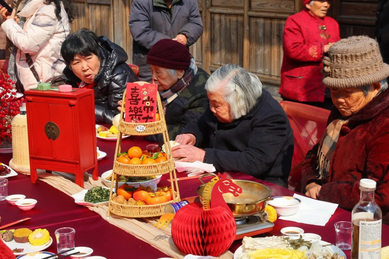 整场活动以“五福”理念为脉络,巧妙融入徐福东渡传说等本土文化元素,通过红灯笼、春联、仿古布景的视觉营造,既展现了龙山独特的地域风情,又烘托出浓郁传统的中国年味。龙山镇党委委员韩亦妙表示:“这是我们第一次在新春时节举办长桌宴,希望通过这样的形式为村民送上新年的第一顿团圆饭。我们邀请了百岁老人、国际友人、时代楷模、各行各业代表和属马的游客共同参与,选取‘慈溪十大碗’等本土菜肴,就是想让更多人在团圆中共品家乡味、共叙乡土情。”