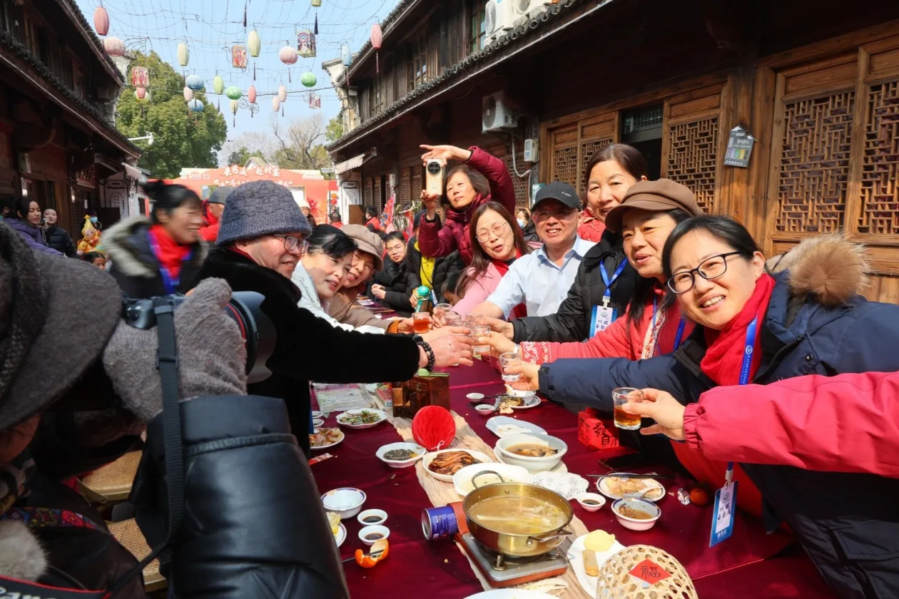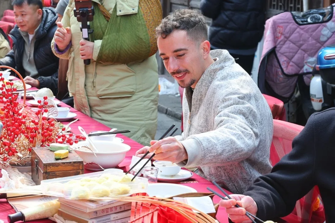 来自法国的Loann表示:“第一次参加长桌宴很新奇,第一次吃松花汤团很特别,慈溪的乡村生活很好。”99岁的山下村村民虞静玉在儿媳妇的陪伴下也来到了现场,非常感慨:“交关好,让我想起早些年的春节,也像现在这样热闹,最好每年都能这样。”游客们围坐长桌,在热气腾腾的品鉴中溯源山海本味,在欢声笑语里感受乡村团圆宴的温暖氛围。长桌宴不仅是一场味觉盛宴,更成为连接情感、传递年味的生动场景。