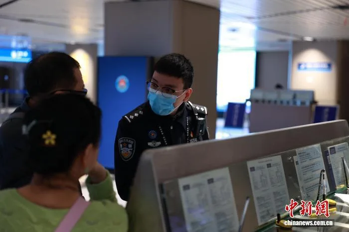 哈尔滨出入境边防检查站移民管理警察为入境旅客讲解240小时过境免签政策。 陈尚楠 摄