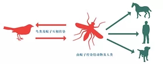 通常,人类会因被蚊子叮咬而感染该病毒。当蚊子以携带西尼罗河病毒的鸟类为食时就会感染,病毒会在蚊子体内循环几天,最终到达蚊子的唾液腺。之后当它再吸血时(蚊子叮咬时),病毒就有可能被注入人体和动物体内,随之繁殖并可能引起疾病。
