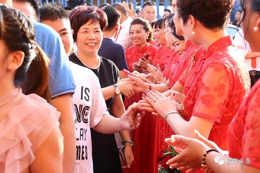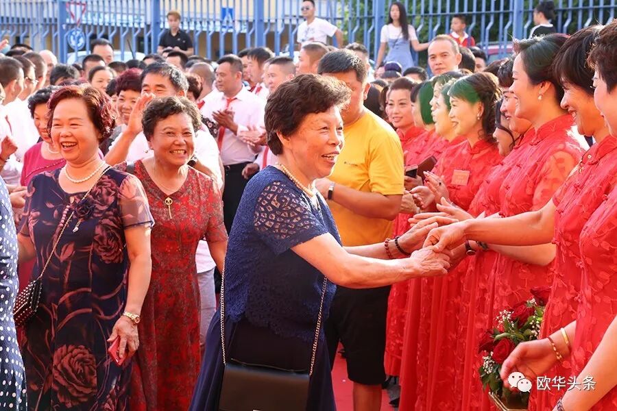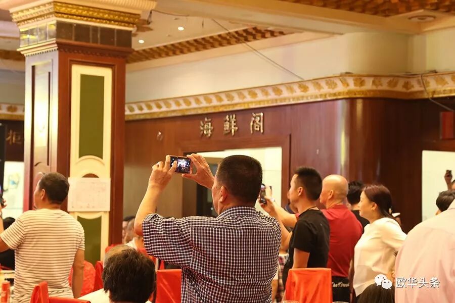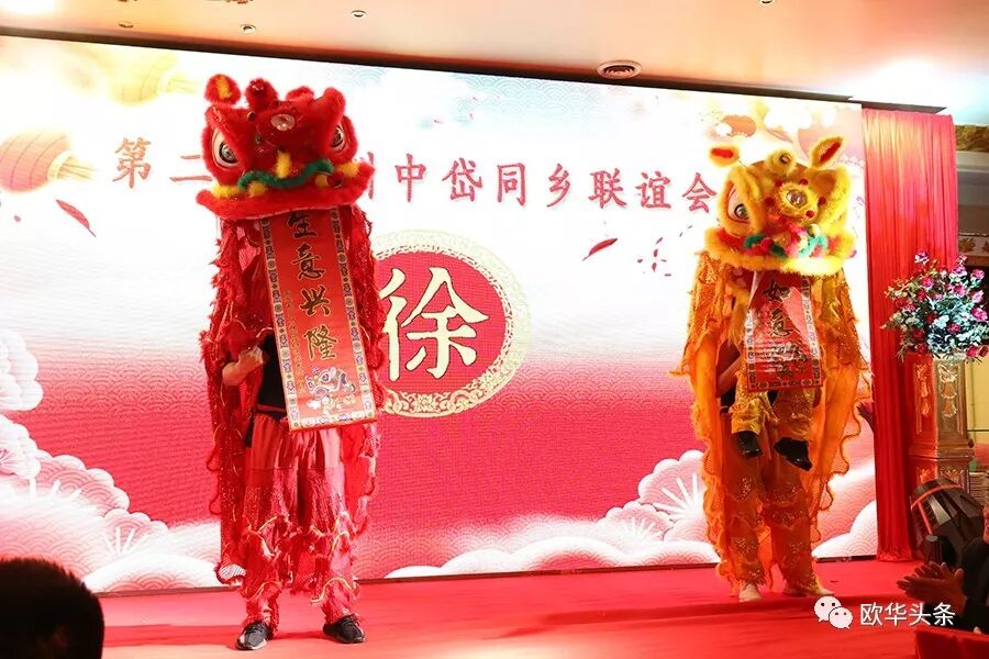 同乡会开始之前,参与嘉宾首先在华侨饭店门口集体合影留念。随后,舞狮表演开始,两头雄狮在激昂的鼓点中移步跳跃,非常喜庆热闹。乡亲们在阳光下走进饭店,重逢的欢笑声不绝于耳。就坐完毕,大屏幕播放徐氏族歌,全体起立表示尊敬和致意。