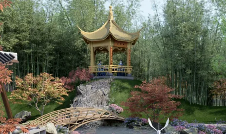 园中构筑物亦延续这一语汇。竹亭、竹桥、竹灯等结构以竹为主要材料,在保留自然肌理的同时融入传统竹工艺与现代结构方式,使构筑物既具功能性,也成为风貌表达的一部分。