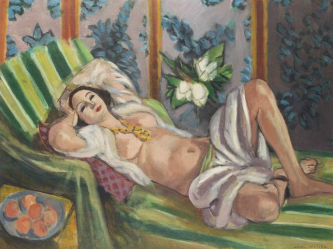 1923年,野兽派代表马蒂斯在尼斯创作此画:深绿色调的睡毯,黄黑的壮实身体,红粉交织的枕头,黄色的项链,画家把多种色调融合的是那么恰到好处。