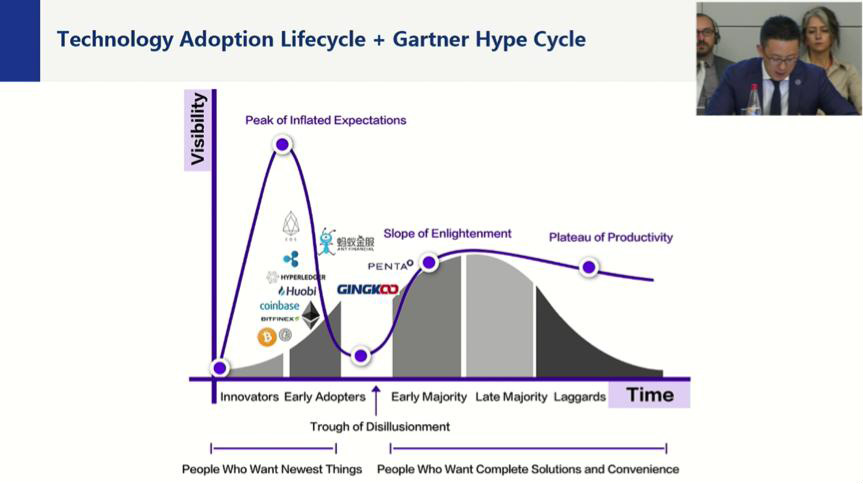 以技术采纳生命周期和Gartner’s技术成熟度曲线为参考,左鹏首次提出了区块链生命周期概念。他认为目前区块链发展正处于技术采纳生命周期中的早期采纳者阶段,与真正进入主流市场为大众所接受,中间存在着一个巨大“鸿沟”。使用区块链世界的连接器可以打通技术发展初期的瓶颈和未来高效上升区间的断层,让区块链连接实体经济,从而跨越这个区块链技术发展的“鸿沟”。