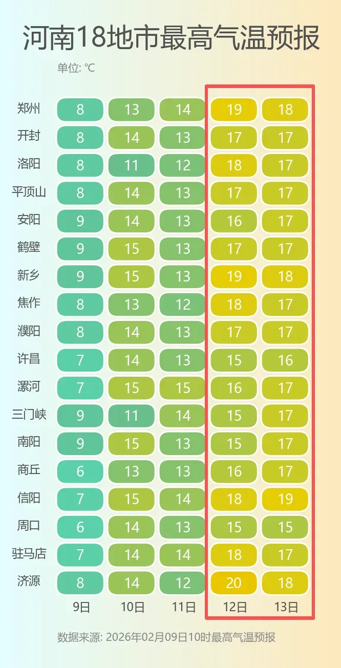 从今天开始,全省气温将一路走高。2月12日(周四),多地最高气温将接近20℃。到了2月14日(周六),也就是除夕前的那个周六,升温将达到巅峰,全省大部最高气温有望突破20℃大关。