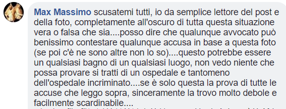 Max:对不起, 我通过简单帖子和照片, (只能说)真实或虚假完全在黑暗中... 我可以说, 任何律师都可以完全质疑任何基于这张照片的指控 ... 这可能是任何地方的厕所, 我看不到任何能证明它是医院的东西... 这只是我读到的所有指控证明...它非常简单无力。