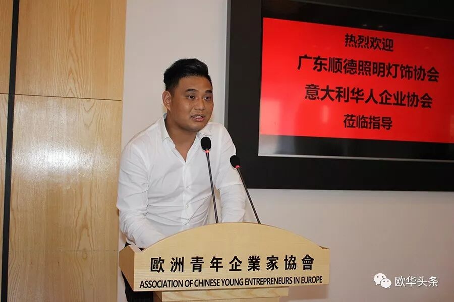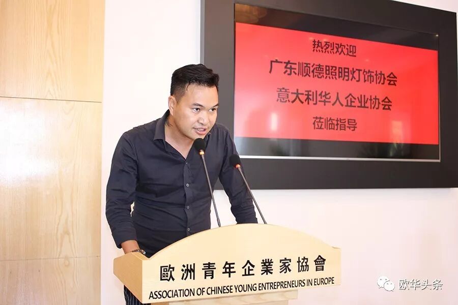 ▲欧洲青年企业家协会会长黄勤海向远道而来的广东顺德照明灯饰协会吴志强会长一行表示热烈的欢迎,期待今后加强沟通与合作,也祝愿吴会长一行访问意大利取得圆满成功!同时,感谢意大利华人企业协会毛爱彬会长一行莅临协会参观指导工作,借此机会感谢在所有同仁的见证下,协会与意大利华人企业协会的签约合作仪式,希望我们携手搭建一个学习交流、相识相知、投资兴业、合作共赢的大舞台。致辞最后,黄勤海会长向长期以来关心与支持他的兄弟们表示衷心的感谢,他表示,随着多名新会员的加盟,欧洲青年企业家协会会更加强大,祝愿大家合作愉快、身体健康、事业发达!