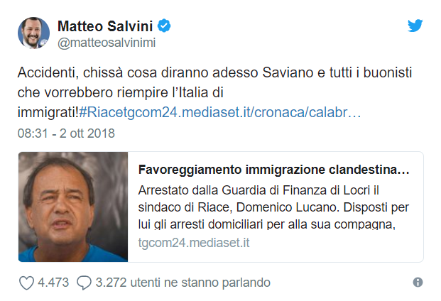 调查最终结果还没出炉,老冤家萨尔维尼则立刻在推文中评论道:“天哪 !谁知道萨维亚诺和那些所有希望移民填塞满意大利的好人们会说什么!”。