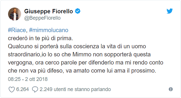 意大利演员 Beppe Fiorello 则同样声援市长,他写道;“我比之前更信任你,有人将会意识到这个非凡男人事迹的。我知道米莫定无法承受这种屈辱。我现在本试图寻找言语为他辩解,但我意识到与其(用言语)捍卫他,他更应该像他爱邻居(移民)一样的被爱戴。