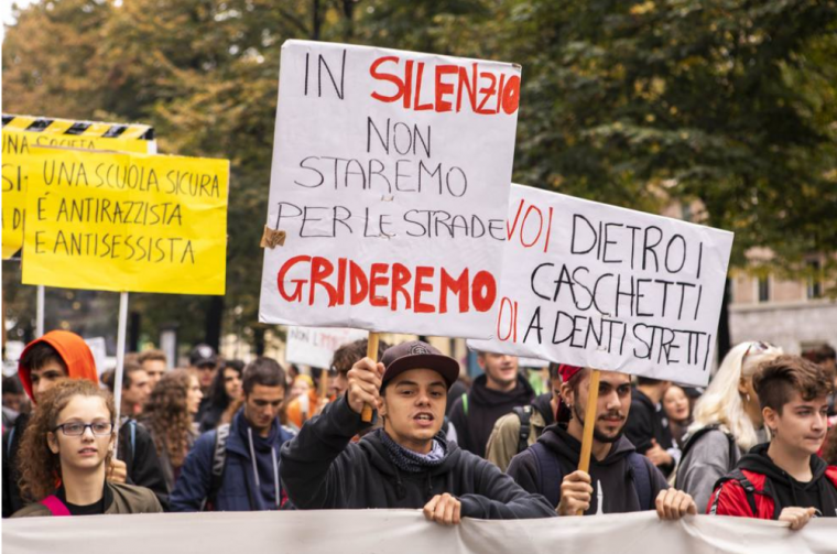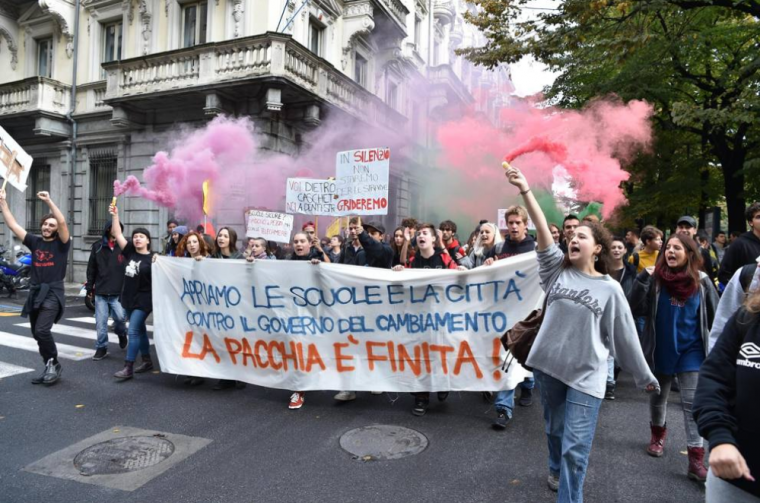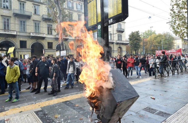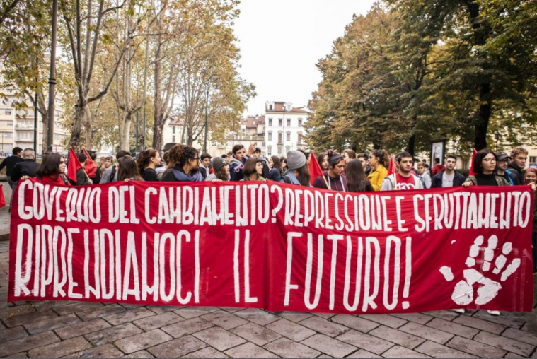在都灵,群情激奋的学生们焚毁了副总理马特奥·萨尔维尼和路易吉·迪马奥的假人模型宣泄不满。学生的游行队伍从Piazza Arbarello开始,穿过市中心的街道到达Castello广场。