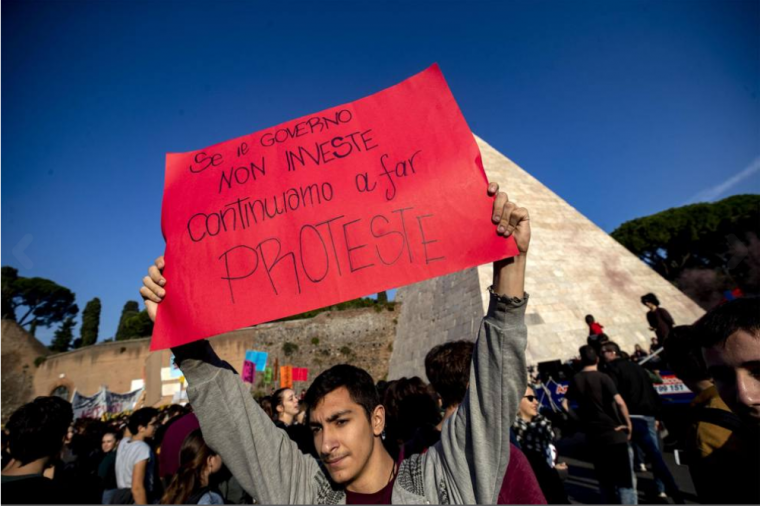 罗马的抗议活动从Piazzale Ostiense开始,学生们打出来“Chihapaura di cambiare? Noi no!(谁畏惧变革?我们绝不(畏惧)!)的标语。愤懑的学生们开始投放烟雾装置,导致该地的交通严重堵塞。