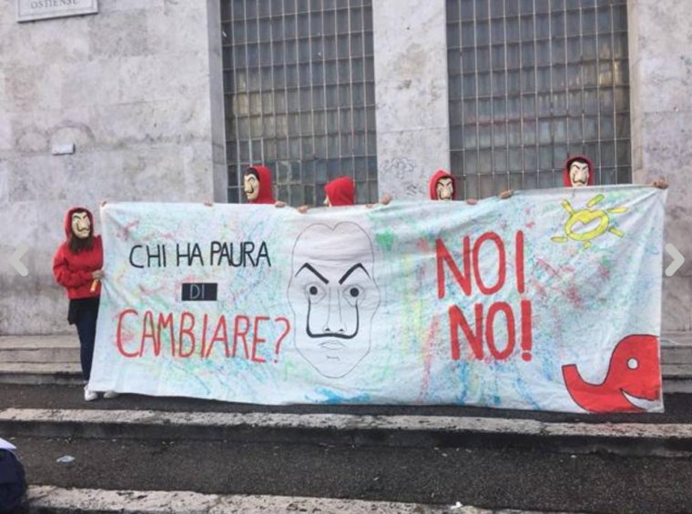 在Vittorio大街,学生们更点燃了放在砖块顶部的纸板监控相机模型。由于各地学校受令开始安装监控,学生们对于此举潜在侵犯隐私及试图监视行动的可能性表现出很大的弹性。