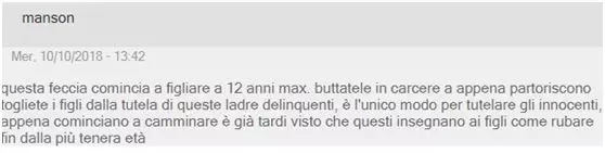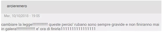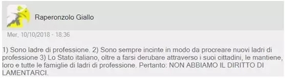 网民@Raperonzolo Giallo还列出了3点原因:1.她们是专业小偷;2. 他们总是怀孕,以生育新的职业盗贼;3.意大利政府的纵容造就了一切,让她们偷意大利公民,而且还养着这一群群的窃贼家庭。而且:我们连抱怨的权利都没有!