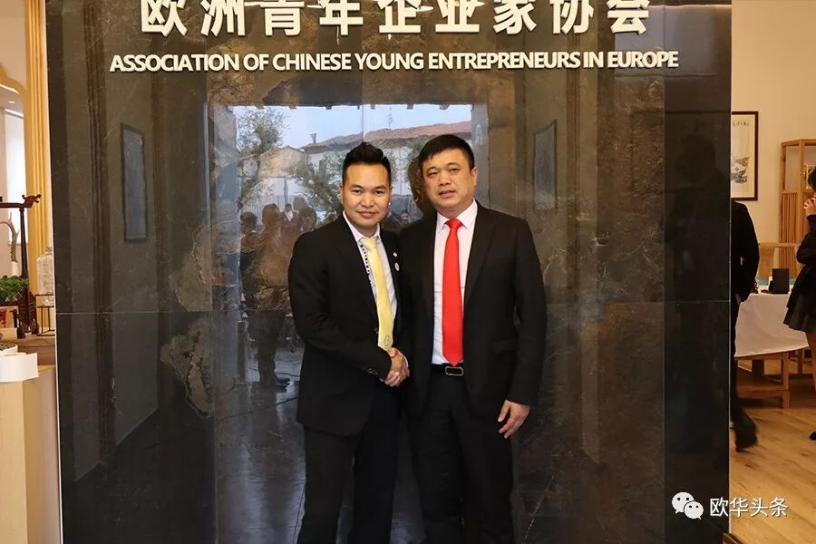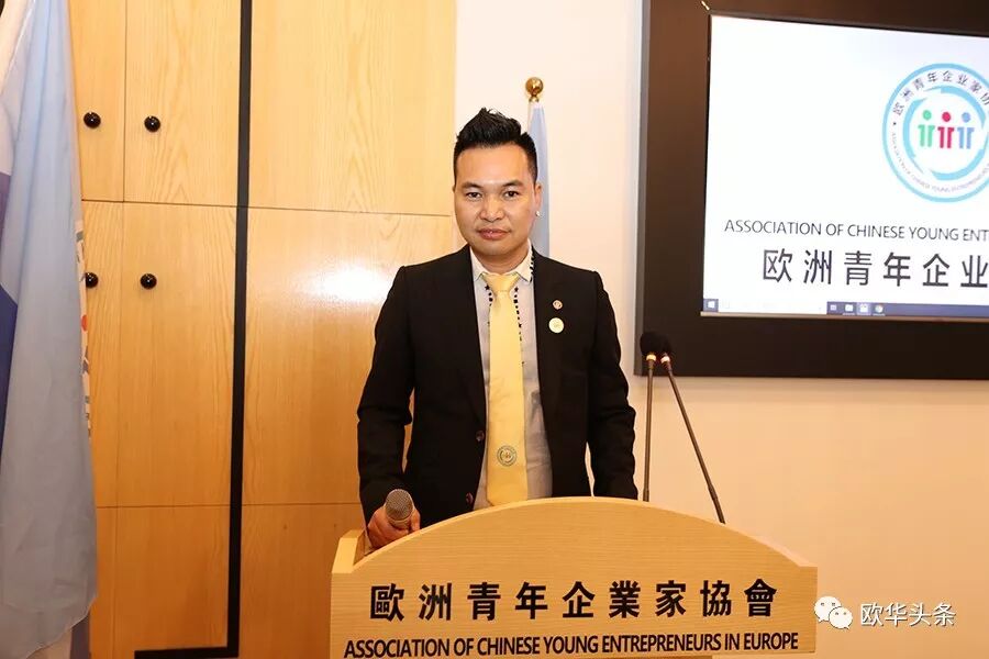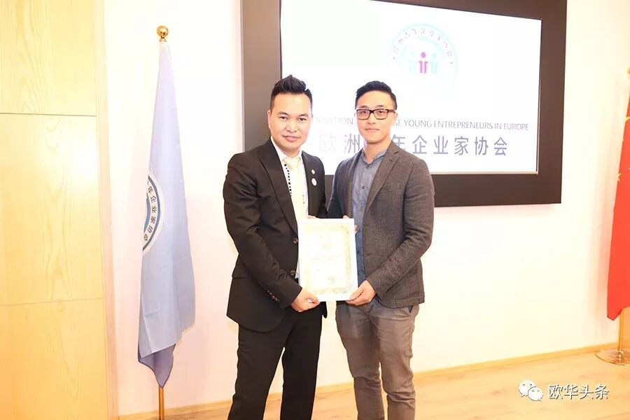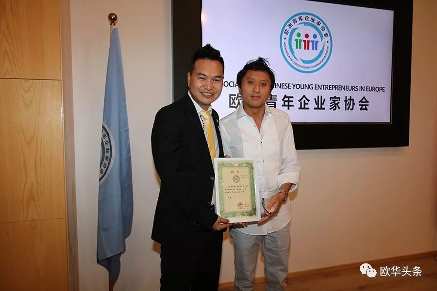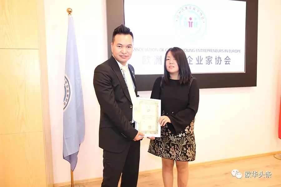 ▲欧洲青年企业家协会会长黄勤海向常务副会长余章颁发荣誉证书