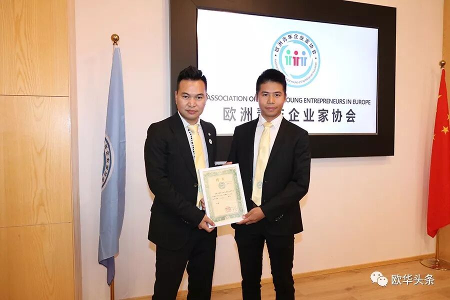▲欧洲青年企业家协会会长黄勤海向副会长丁剑新颁发荣誉证书