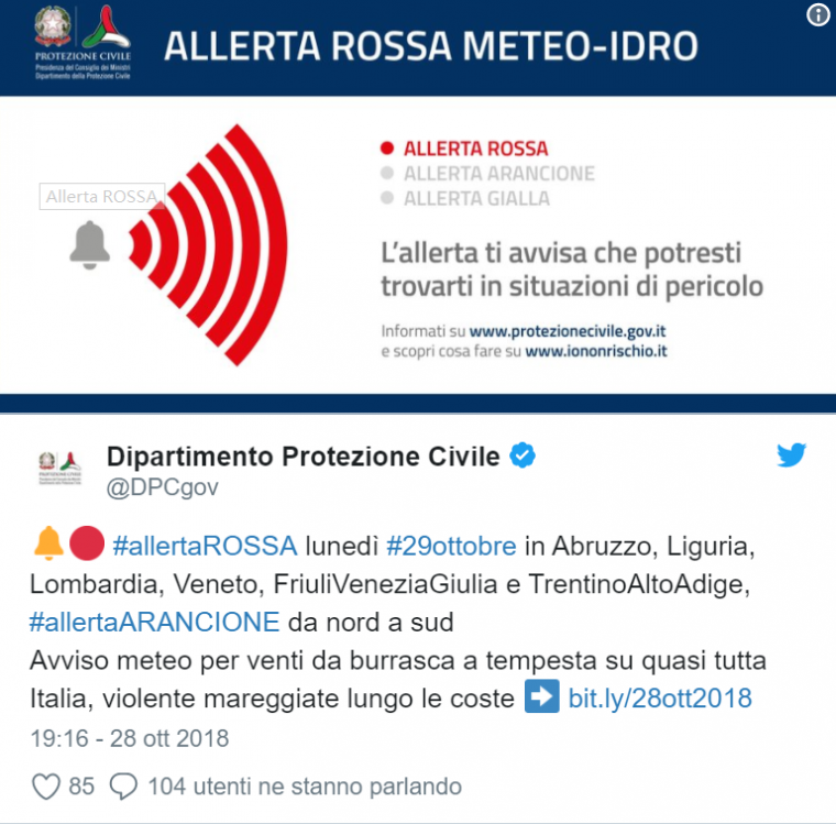 恶劣的天气使得伦巴底大区的阿尔卑斯山脉前麓地区,威尼托大区,弗留利威尼斯朱利亚大区和利古里亚大区以及阿布鲁佐大区的部分地区拉响了红色警报。