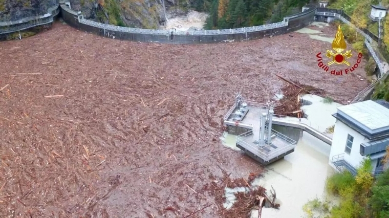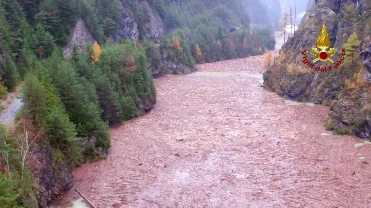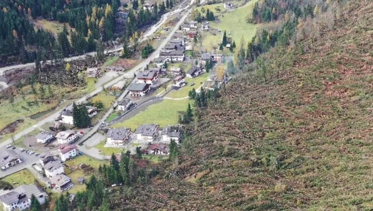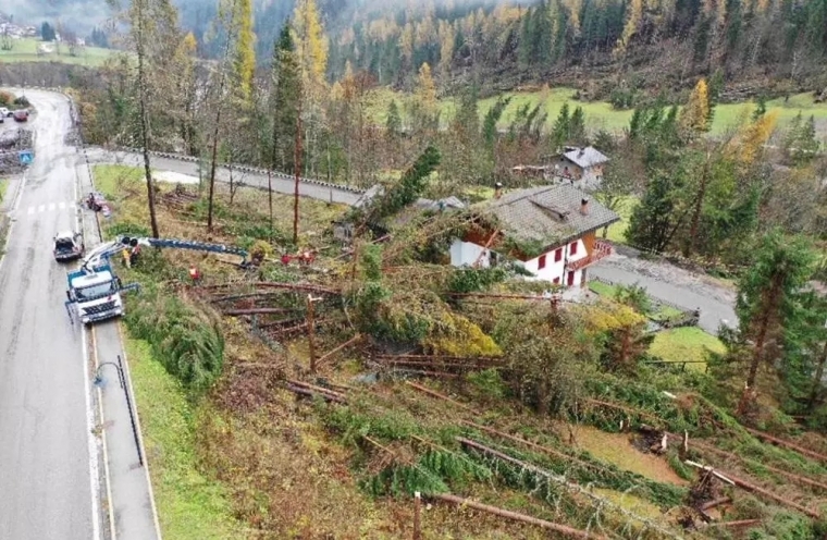 威尼斯以北100公里的贝鲁诺附近阿尔卑斯山区,大量松树与红杉树在强风下如火柴般倒下。在靠近奥地利边境的上科梅利科,大量折断树木沿河飘流至一个水库,令水面布满断树。