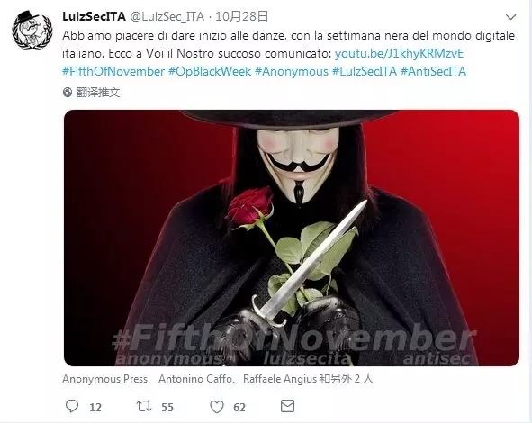 意大利匿名者黑客组织在推特上为“黑色一周”揭幕。(图片来源:推特)
