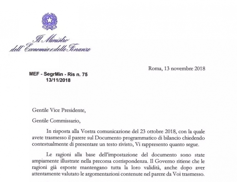 综合安莎社、意大利《共和国报》报道,意大利经济部长特里亚在13日递交给欧盟委员会的信件中说到,“意大利政府坚持2019年财政赤字为2.4%,这将是一个不可逾越的界限。”
